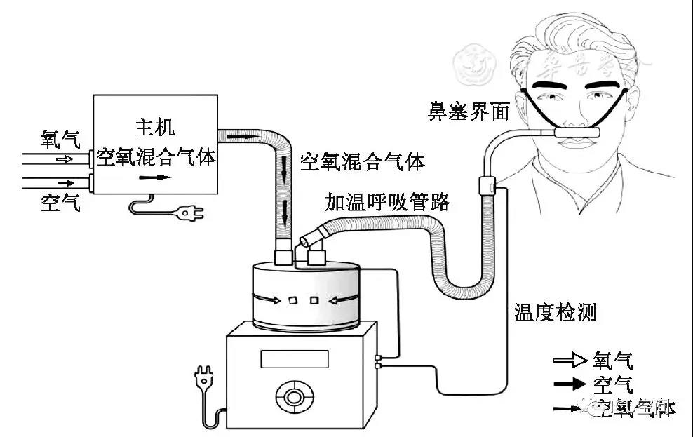 HFNC是指一種通過高流量鼻塞持續(xù)為患者提供可以調(diào)控并相對恒定吸氧濃度(21%~100%)、溫度(31~37 ℃)和濕度的高流量(8~80 L/min)吸入氣體的治療方式。該治療設(shè)備主要包括空氧混合裝置、濕化治療儀、高流量鼻塞以及連接呼吸管路[3]。結(jié)合國內(nèi)和國際通用命名習(xí)慣,本共識統(tǒng)一采用"經(jīng)鼻高流量濕化氧療"進(jìn)行表述,英文簡稱為HFNC(圖1)。