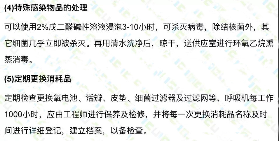 呼吸機(jī)的消毒應(yīng)遵循先徹底清洗,尤其是接觸患者的呼出氣體的部分,如管道、加溫濕化器和呼氣閥等(部分呼吸機(jī)帶細(xì)菌過(guò)濾器),可先用清洗劑沖洗,將其中的分泌物,痰痂等徹底清除,然后再消毒。消毒后經(jīng)蒸餾水沖洗晾干備用。經(jīng)化學(xué)消毒劑消毒后的呼吸機(jī)管路應(yīng)用蒸餾水清洗,而不建議用自來(lái)水,以免造成不必要的污染。